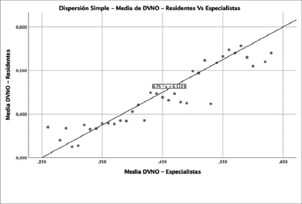 Gráfico 2. Dispersión simple, media del DVNO residentes vs especialistas.