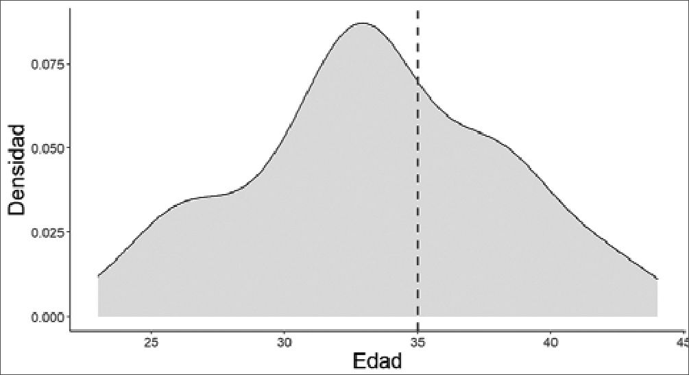 Figura 1. Gráfico de densidad de la edad de las mujeres estudiadas. La distribución de los datos muestra una concentración en 33,46 años, antes de alcanzar los 35 años, que es el umbral considerado como edad avanzada para el embarazo materno.