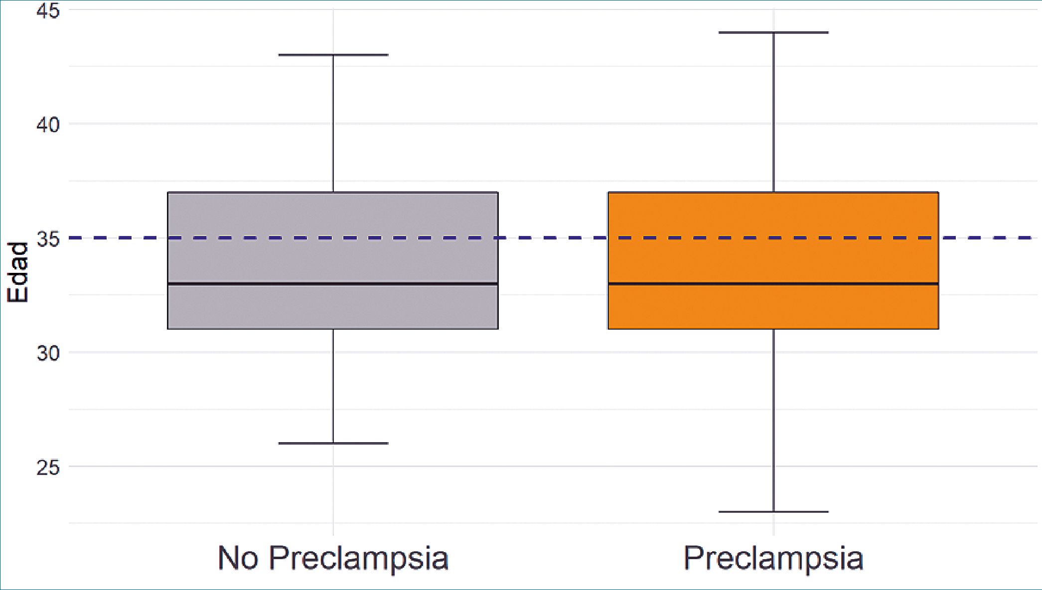 Figura 2. Gráfico boxplot de la edad, dividido en dos grupos: mujeres con preeclampsia y sin preeclampsia. En la visualización se observa que el rango intercuartílico de ambas condiciones es similar, y los valores de Q1, Q2 y Q3 se encuentran por debajo de los 35 años.