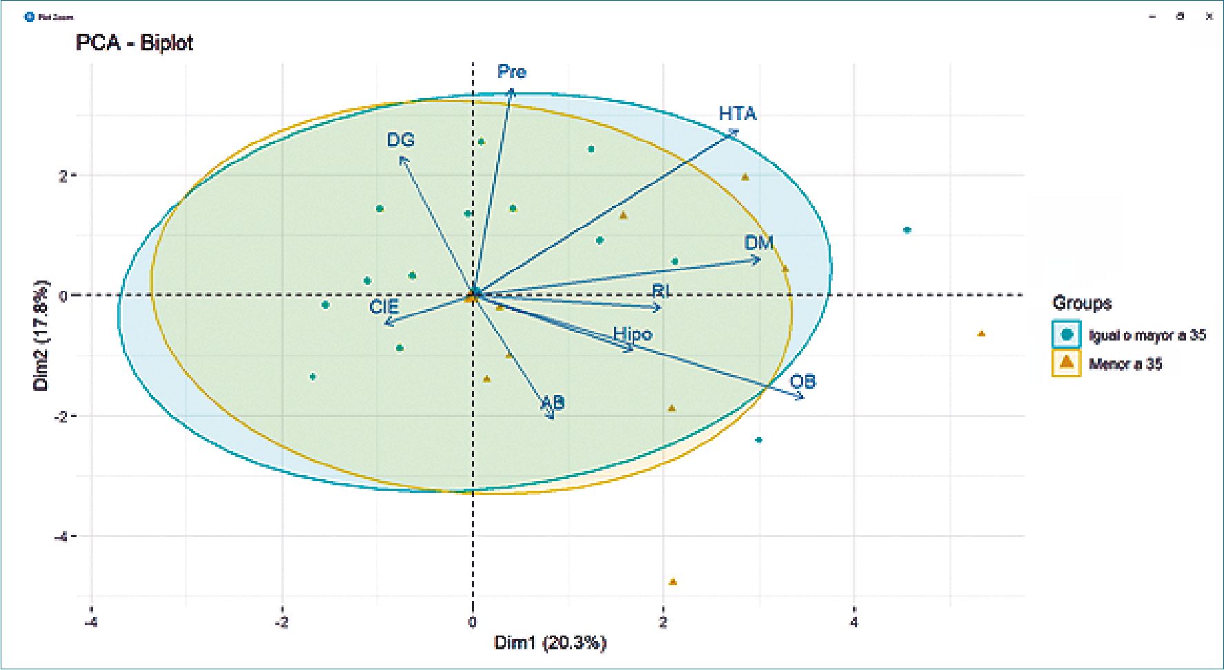 Figura 3. Análisis de componentes principales. El análisis cuantitativo de PCA (primer componente principal explica 20,3% de la variabilidad total, mientras que el segundo componente principal explica 17,8%), reveló que la combinación de variables clínicas comorbilidades y edad con punto de corte a los 35 años, no proporciona un espacio de separación para ambos grupos. Pre: Preeclampsia; DG: Diabetes gestacional; HTA: Hipertensión Arterial Primaria; CIE: Colestasia Intrahepática del Embarazo; DM: Diabetes Mellitus; AB: Asma Bronquial; OB: Obesidad; Hipo: Hipotiroidismo; CC: Cardiopatìa Crónica.