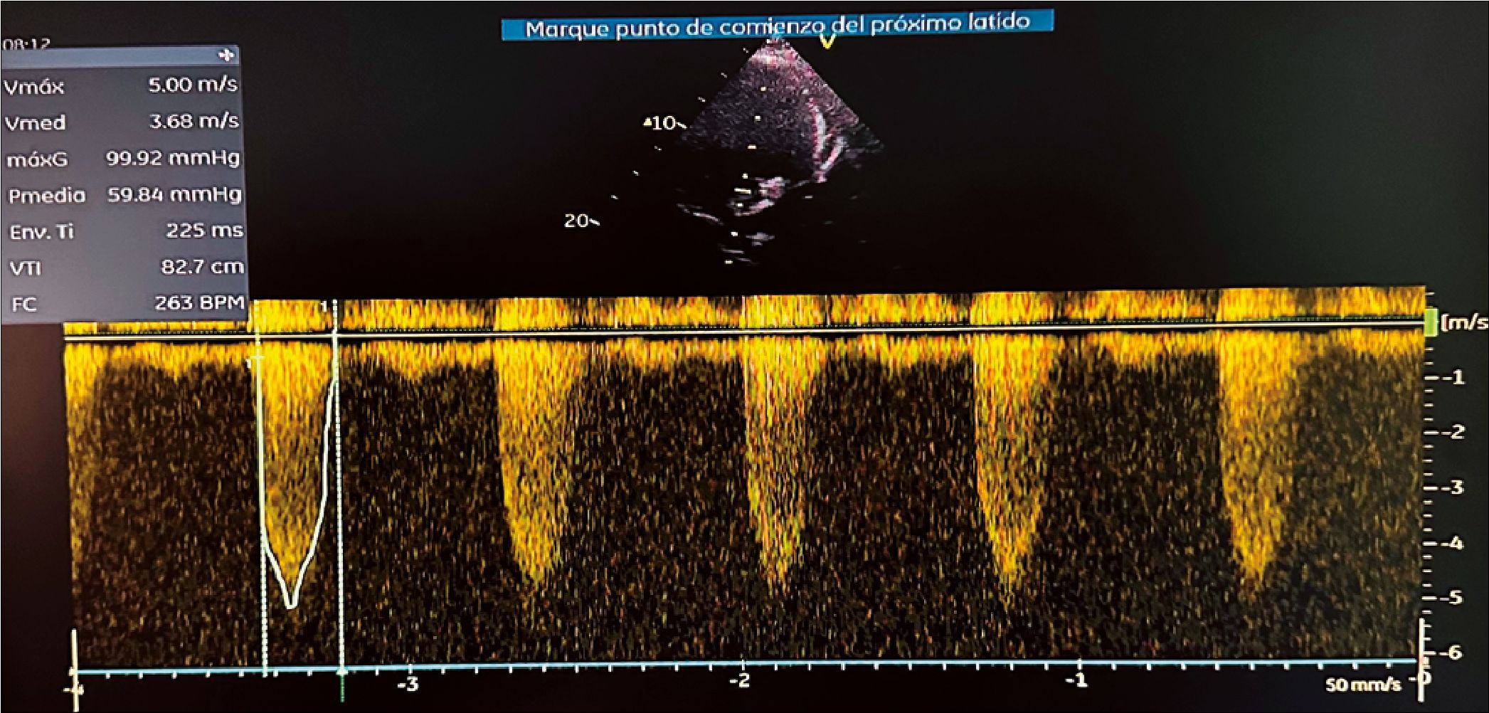 Se solicitó ecocardiograma transtorácico que informó: ventrículo izquierdo (VI) de dimensiones normales, con hipertrofia concéntrica severa, sin trastornos sectoriales de la contractilidad. FEVI 60%. Patrón de llenado del VI prolongada (E:1,15 m/s, A:0,94 m/s, e’:0,10 m/s, E/e’: 11,5). Aurícula izquierda y derecha de dimensiones normales. Ventrículo derecho de función y dimensiones normales. Válvula aórtica con estenosis crítica, VMax 5 m/s gradiente medio 59,84 mmHg, gradiente máximo 99,9 mmHg, AVA 0,94 cm 2, AVA indexada 0,5 cm2/ m2. Resto válvulas normales.