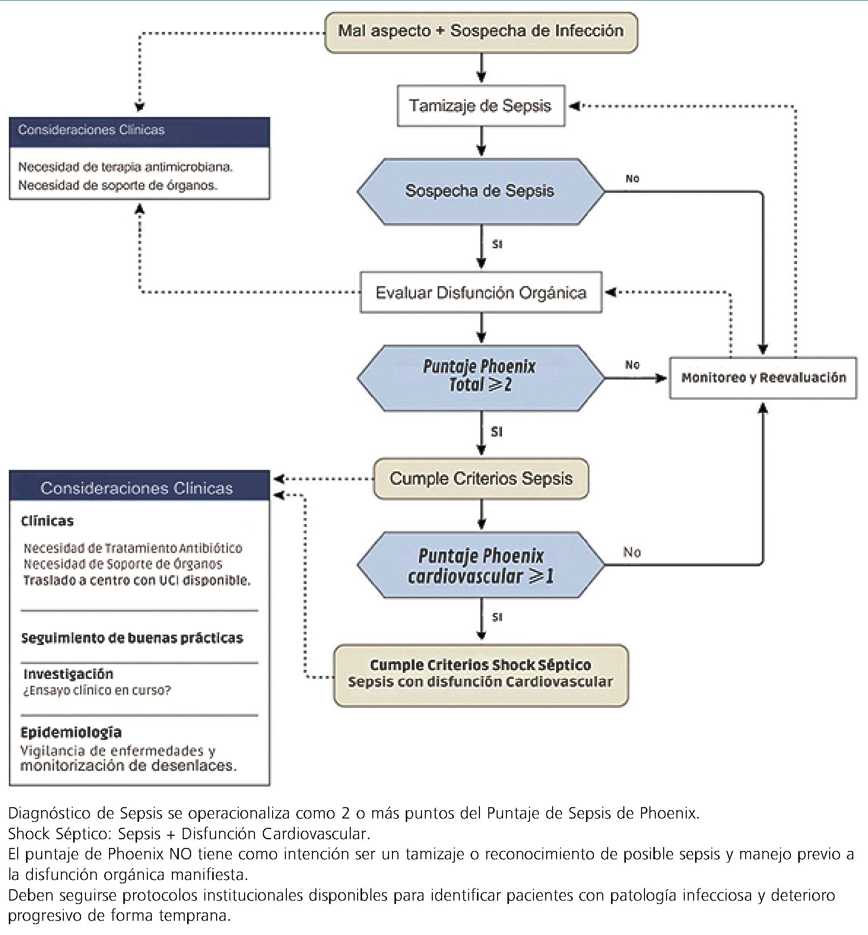 Figura 1. Algoritmo de reconocimiento Según Criterios de Severidad de Sepsis Phoenix. Modificado a español de Schlapbach LJ, Watson RS, Sorce LR, Argent AC, Menon K, Hall MW, et al. International Consensus Criteria for Pediatric Sepsis and Septic Shock. JAMA [Internet]. 27 de febrero de 2024;331(8):665. Disponible en: https://jamanetwork.com/journals/jama/fullarticle/2814297