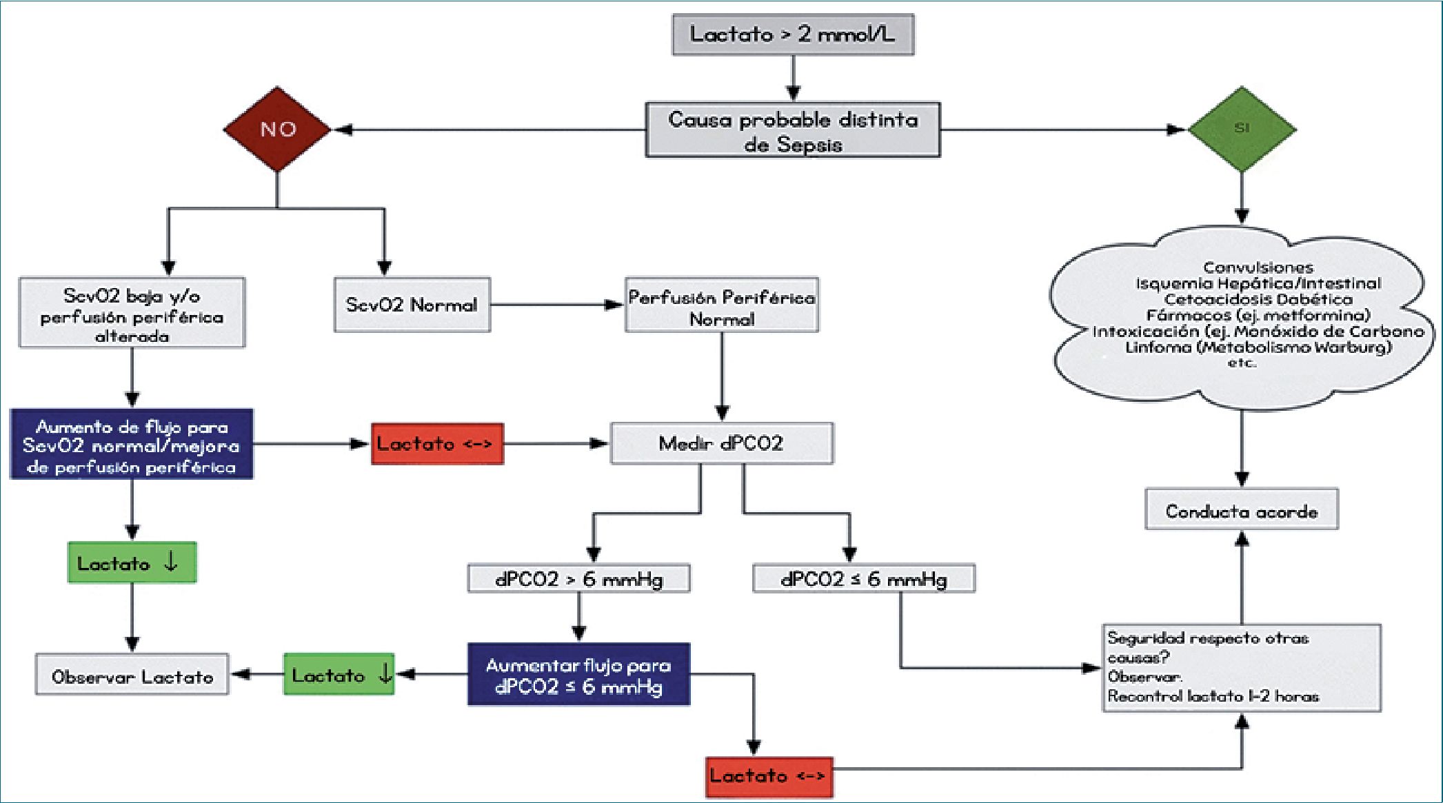 También se sugiere usar tendencias en los niveles de lactato seriado junto al análisis simultáneo de parámetros sensibles a flujo, tales como; saturación venosa central de oxígeno (SvO2), gradiente de CO2 venoso central-arterial y la perfusión periférica (Figura 2). Reconocer un patrón clínico de hiperlactatemia asociado a hipoperfusión tisular es importante ya que optimizar el flujo sanguíneo sistémico en ese contexto podría mejorar el pronóstico[15].