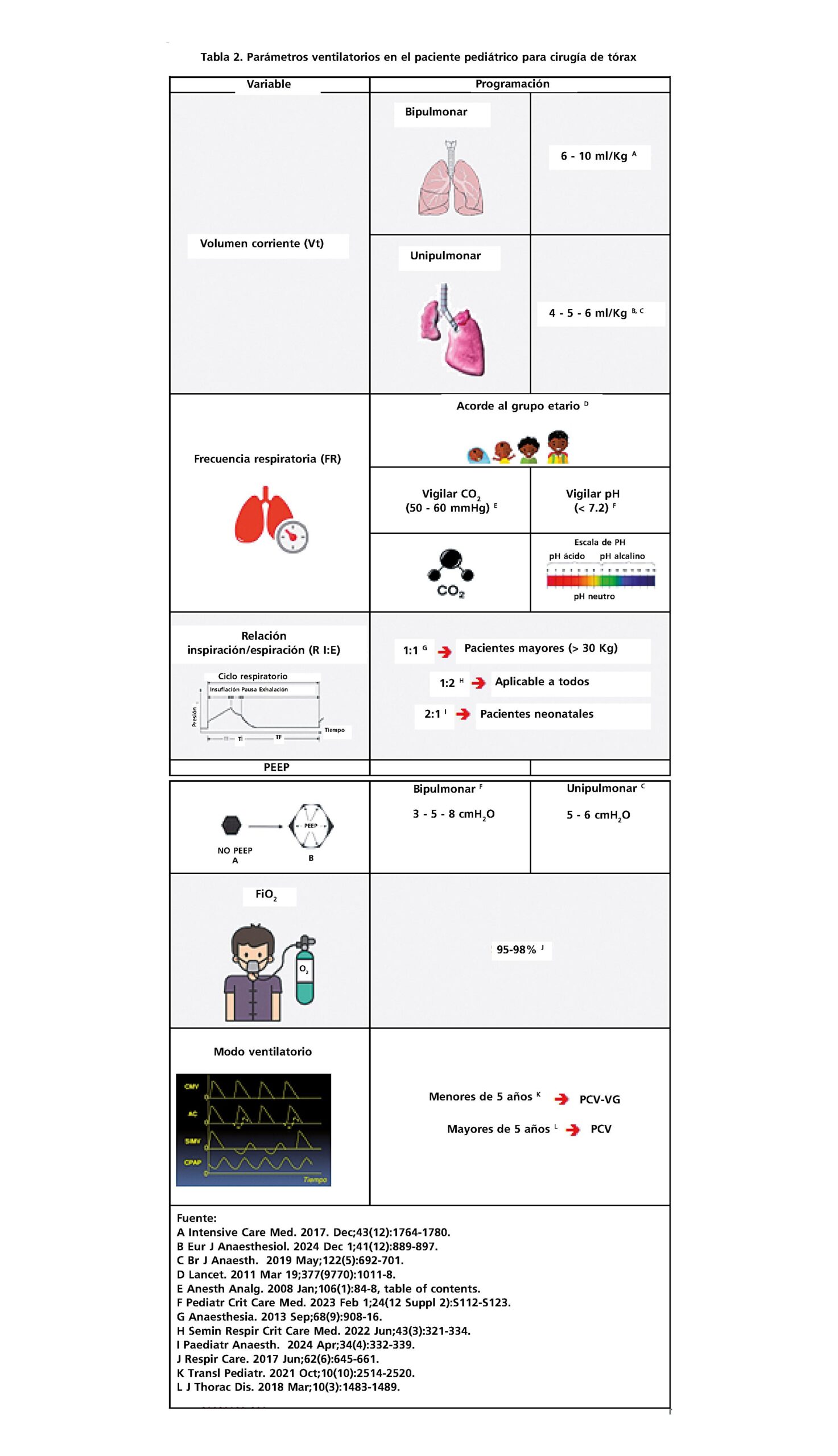 En la Tabla 2 mostramos un resumen visual de la programación parámetro a parámetro con la evidencia actual. Es necesario seguir realizando estudios en la población pediátrica, ya que el advenimiento de nuevas tecnologías para lograr el colapso pulmonar a edades cada vez menores hace que la ventilación mecánica a un solo pulmón sea todo un reto para el anestesiólogo. Tabla 2. Parámetros ventilatorios en el paciente pediátrico para cirugía de tórax