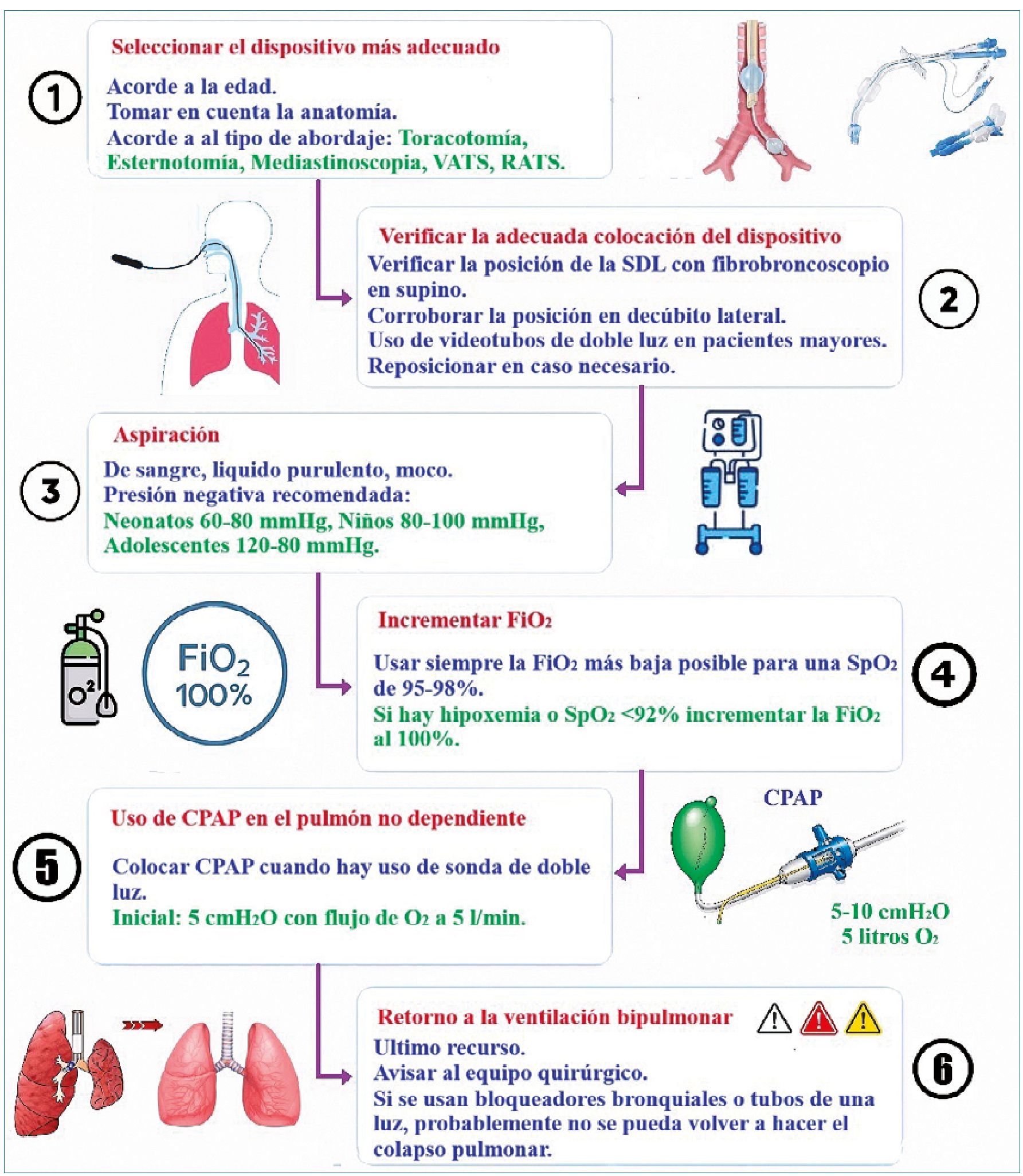 1. Seleccionar el mejor dispositivo: Las características anatómicas y fisiológicas de la población pediátrica hace que la VUP y la correcta exclusión pulmonar sea un reto. Se debe practicar las diferentes competencias necesarias para una adecuada exclusión pulmonar (colocación de bloqueadores bronquiales, uso de fibrobroncoscopio, colocación de sondas de doble luz y exclusión pulmonar con tubos de una sola luz). En la Figura 1 se observa el mejor método de exclusión pulmonar por grupo etario.