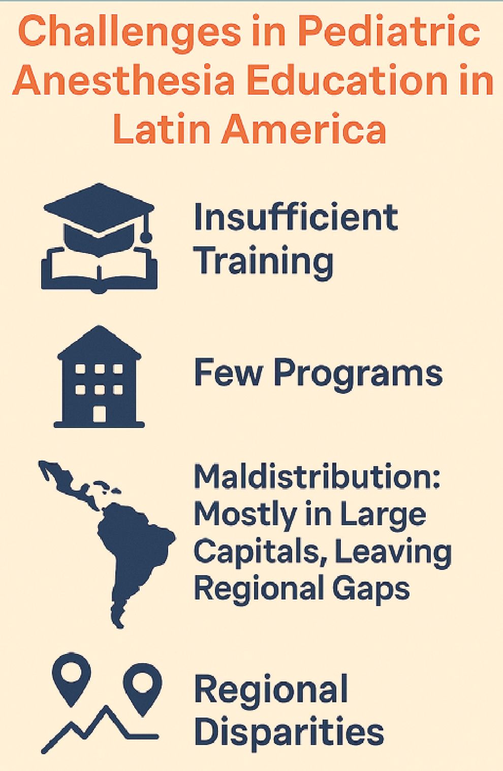 Latin America’s shared linguistic, cultural, and historical context provides a unique opportunity to foster regional collaboration in pediatric anesthesia education. While countries differ in healthcare structure and economic development, they face common challenges-unequal access to training, concentration of resources in urban centers, and limited recognition of pediatric anesthesia as a subspecialty. Rather than reinventing the wheel within each country, regional cooperation can accelerate progress and optimize resource use.