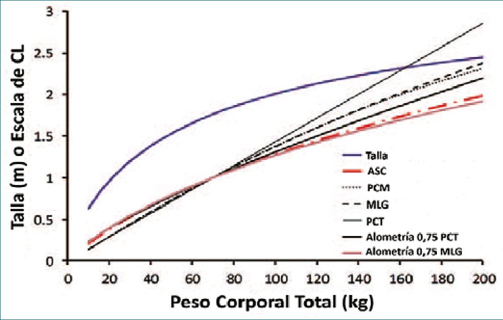 PCT = peso corporal total; PCI = peso corporal ideal; PCM = peso corporal magro; MLG = masa libre de grasa; PCA = peso corporal ajustado, VD = volumen de distribución; CL = aclaramiento (clearance); MNG = masa normal grasa; ASC = área de superficie corporal.