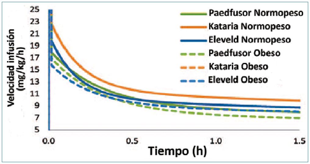 Los modelos TCI pediátricos clásicos de propofol disponibles en las bombas comerciales, tales como Paedfusor[38] o Kataria[39] no están diseñados para uso en población obesa y cuando son utilizados en este tipo de pacientes pueden llevar a sobredosis, especialmente el modelo de Kataria que escala linealmente al PCT tanto los VD’s como los CL’s. Sin embargo, Paedfusor eleva su constante de eliminación a un exponente de 0,3, haciendo que su CL se escale casi alométricamente (escalamiento no lineal), por lo que debería dosificar mejor en esta población durante la mantención. Nuevos modelos que utilizan un escalamiento alométrico y el PCT, como el desarrollado por Eleveld et al.[40], ha mostrado buen rendimiento en adultos y niños normopeso, como también en adultos obesos. Aunque el modelo no ha sido validado específicamente en población pediátrica obesa, es probable que su utilización en esta población sea adecuada (Figura 2).