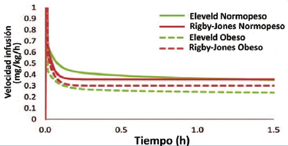 Al igual que con el propofol, la limitación más importante de una TCI de remifentanilo en pacientes pediátricos obesos es la ausencia de modelos adecuados programados en las bombas comerciales disponibles. El modelo de Minto et al.[41], disponible en las bombas de TCI, no se derivó de individuos obesos, ni tampoco de pacientes pediátricos, por lo tanto, su uso en población pediátrica obesa no estaría recomendado. El modelo de remifentanil desarrollado por Eleveld et al.[25], caracterizó la farmacocinética de este fármaco en pacientes adultos y niños no obesos, utilizando parámetros escalados a MLG con la ecuación de Al Sallami, un factor de maduración basado en la edad postmenstrual y relaciones alométricas compartimentales. Sin embargo, la presencia de población obesa en el modelo, especialmente niños obesos, es prácticamente nula. De esta forma, la dosificación y precisión en las concentraciones predichas es incierta en población pediátrica obesa, tanto del modelo de Eleveld, como el modelo pediátrico de Rigby-Jones et al.[42], para remifentanilo, que incluyen solo niños no obesos. En este sentido pareciera razonable utilizar estos modelos con pesos ajustados, asegurándose que administren velocidades de infusión (mcg/kg/min) más bajas en un niño con obesidad (Figura 3).
