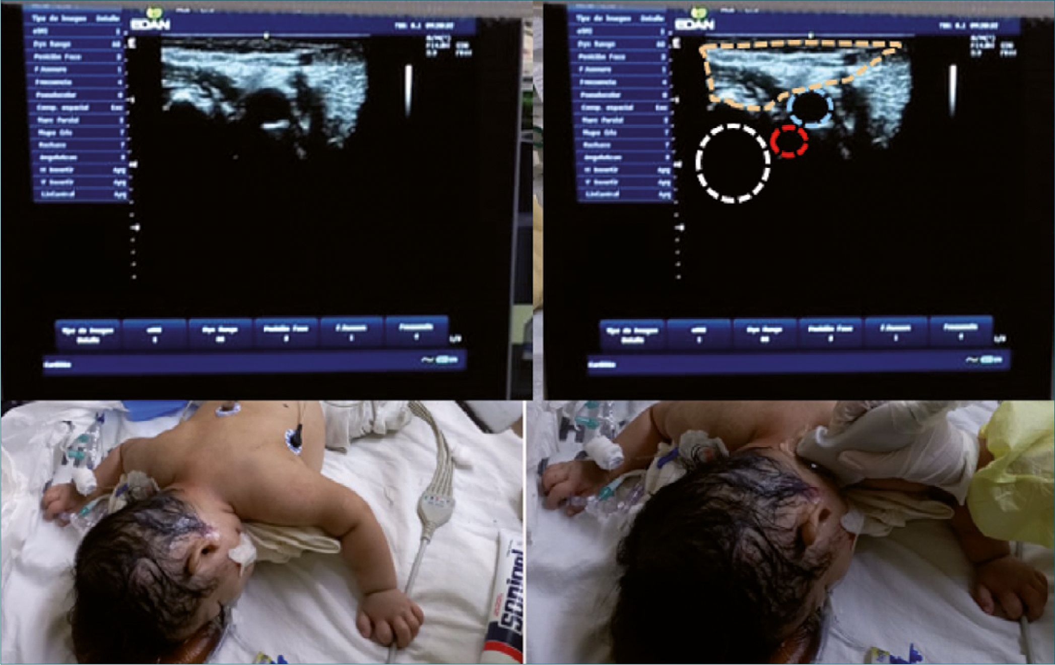 Paciente de femenina de 3 meses, 4 kg de peso, con diagnóstico de shock séptico y Síndrome de Distrés Respiratorio Agudo Pediátrico (SDRAP) grave, por neumonía de la comunidad. A su ingreso al hospital requiere ventilación invasiva y se coloca CVC subclavio derecho para terapéutica y monitoreo. El día 3 se coloca en posición prono para optimizar oxigenación, logrando objetivos. El día 4, el catéter muestra signos de obstrucción mecánica, que no logra solucionarse y se coloca al paciente en supino para realizar un nuevo CVC, presentando caída de oxigenación, y se reposiciona en prono, recuperándose. POCUS de la región cervical dorsolateral bilateral con transductor lineal de 10 MHz y 4 cm de ancho, en posición axial, muestra las venas yugulares internas (VYI) izquierda de 4 mm y derecha de 5 mm de diámetro en su eje menor, ambas a 9 mm de profundidad (Figura 1). Puncionamos fuera de plano derecho, con búsqueda dinámica de la punta de la aguja a 45°, encontrando la vena a la primera punción, introduciendo guía flexible y luego catéter 4 Fr trilumen, fijado en 7 cm a piel en región dorsal superior del tórax (Figura 2). El día 6 la paciente cumple con criterios para colocarse en decúbito supino, cambiando sentido de la fijación externa del catéter hacia región anterior del tórax del paciente. Continua con evolución satisfactoria, hasta extubarse en el día 11 de tratamiento. El catéter continuó funcional y se retira en el día 16 para continuar farmacoterapia por acceso vascular periférico.