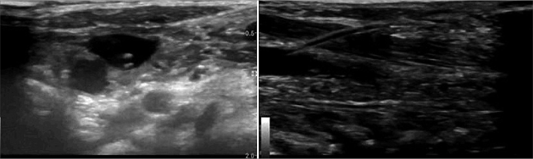 Las técnicas descritas colocan el transductor en la región anterior del cuello, visión en el plano, para lograr observar el vaso y la aguja de forma axial durante su inserción[6],[3]. Al no encontrar literatura que describiera técnica y anatomía esquemática de la región cervical posterolateral pediátrica para inserción de catéter vascular central yugular, adecuamos la técnica a las características encontradas en cada uno de los pacientes y colocar el transductor en la región posterolateral, en visión axial fuera del plano, debido a dos razones: 1) tamaño del cuello del paciente que dificultaba la colocación de nuestro transductor de 4 cm en la región antero-lateral y 2) la práctica de nuestro equipo en pacientes pequeños con este tipo de abordaje. No hubo ninguna complicación durante los procedimientos, se logró el acceso luego de 1 o 2 punciones máximo, los dispositivos fueron funcionales durante todo el tiempo del prono y posteriores al supino, durando 12 y 7 días respectivamente.
