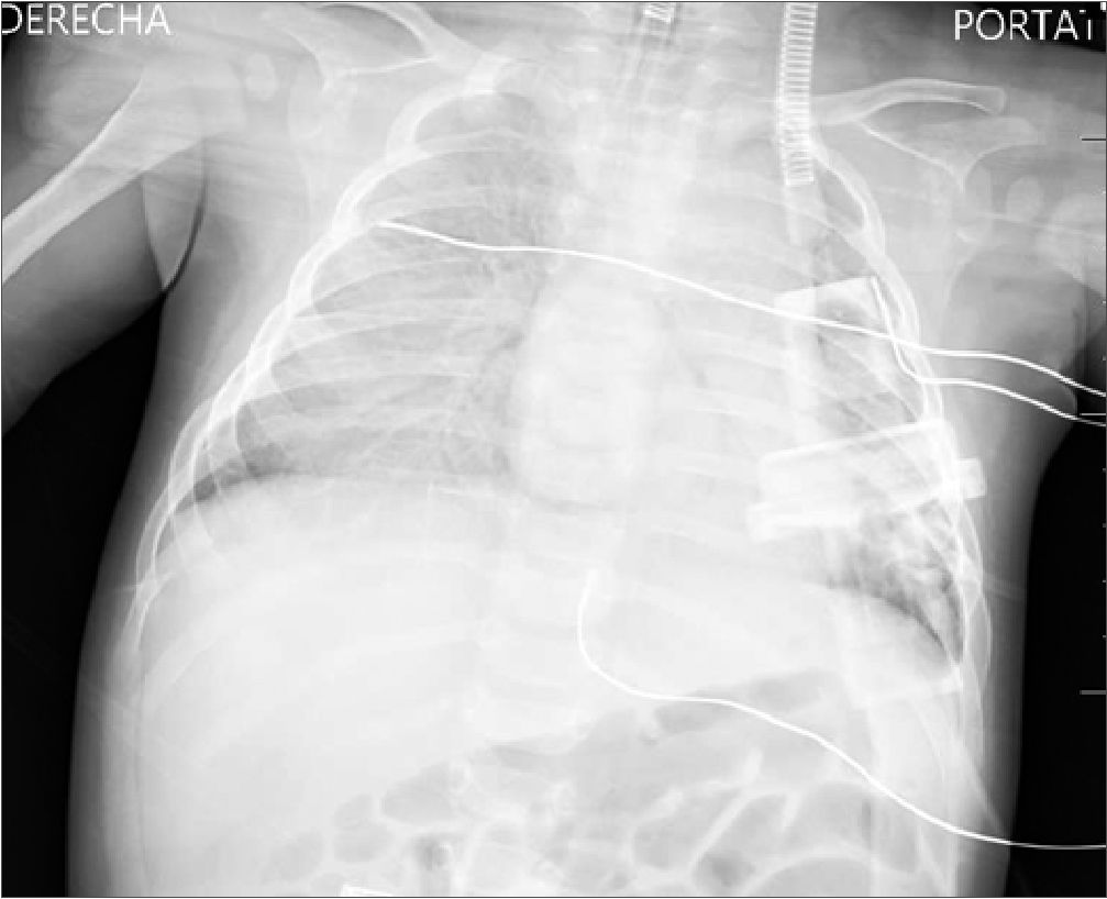 Siendo la situación estable, una vez comenzada la introducción del endoscopio y el suero de irrigación, a los 20 min se produce un episodio de hipertensión sistémica brusca (TA de 150/100), acompañada de bradicardia (FC de 100 lpm), desaturación (SpO2 en descenso desde 100 hasta 70), hipocapnia (ETCO2 de 24) y aumento de presión pico (35) en vía aérea. A la auscultación pulmonar aparecen crepitantes bilaterales y por la aspiración del tubo endobronquial se objetiva salida de líquido claro mezclado con moco. Se comunica al equipo neuroquirúrgico la necesidad de parar la cirugía para resolver la situación. Ante la sospecha de un edema agudo de pulmón, se suspende la infusión de líquidos y hemoderivados y se administra furosemida hasta un total de 6,5 mg/kg intravenoso. Para tratar de mejorar la ventilación, por posible broncoespasmo asociado, se administra salbutamol por cámara 6 puff, sulfato de magnesio 25 mg/kg, ketamina 2 mg/kg e hidrocortisona 1 mg/kg intravenoso acompañada de ventilación manual con FiO2 100%. Se producen recuperaciones parciales de SpO2 hasta 90-95%, pero con intervalos de caída de nuevo hasta 68%-70%. Se realiza placa de tórax intraquirúrgica (Figura 1) que aparenta de aumento de densidad del pulmón derecho con broncograma aéreo y pequeña cantidad de líquido en cisura menor. No se objetivan claros signos de cardiomegalia, aunque la proyección se encuentra ligeramente rotada y el borde cardíaco derecho no se define adecuadamente.