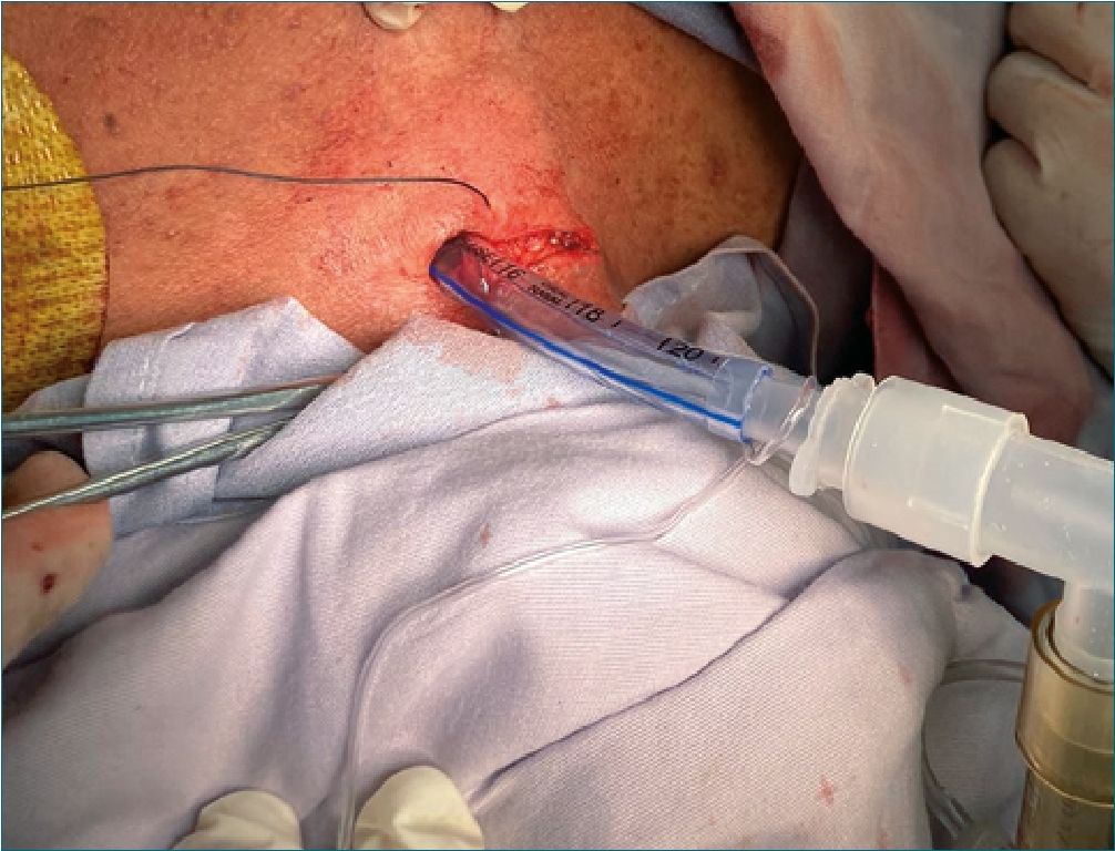Se presenta el caso de masculino de 20 años con diagnóstico actual de intubación prolongada con neumonía por Acinetobacter baumannii secundario a dificultad respiratoria que requirió apoyo avanzado de la vía aérea, programado para traqueostomía; antecedente de seguimiento por ortopedia pediátrica debido a escoliosis neuromuscular, deformidad torácica (Figura 1 y 2), así como manchas características de “café con leche” en tórax y dorso; de manera progresiva a presentado debilidad en extremidades inferiores y múltiples internamientos por procesos neumónicos. En su valoración de predictores de vía aérea no es posible valorar Mallampati ni distancia interincisiva por la presencia de cánula orotraqueal (nnuver® 8,0 mm), protrusión mandibular no valorable, Patii Aldreti grado II (6,0 cm), distancia esternomentoniana grado IV (10 cm), Bellhouse Dore grado I, circunferencia cervical de 45 cm. Durante procedimiento anestésico se realiza monitoreo continuo tipo II; inducción con fentanilo (Kalcex®) 3 mcg/ kg, propofol (Riafol®) 1 mg/kg y cisatracurio (Lukamik®) 150 mcg/kg; se inicia modo ventilatorio tipo presión con FiO2 90%; durante el transanestesico se realiza mantenimiento con sevo- florano 2,5 Vol% alcanzando un CAM 1, línea de curva de cap- nografia presente, monitorización de relajación muscular con respuesta a tren de cuatro (TOF-Watch®). Se procede a realizar traqueostomía con observación de anillos traqueales, retirando tubo orotraqueal al momento de colocar cánula Portex® 7,5 mm, al verificar ventilación con circuito anestésico se observa ausencia de capnografia, y en la elevación de fuelle en máquina de anestesia, por lo que se decide el cambio a cánula Portex® 8,0 mm persistiendo fuga y ausencia nuevamente capnografía; por lo que se realiza nueva videolaringoscopia con Glidescope® observando epiglotitis, desviación a la izquierda de vía aérea, Cormack Lehane IV (Figura 3); por lo que de manera emergente se coloca cánula orotraqueal (nnuver® 8,5 mm) a 15 cm a través de traqueostomía identificando curva de capnografía (Figura 4), con adecuada exhalación de CO2; conservando en todo momento estabilidad hemodinámica. Decidiendo terminar procedimiento quirúrgico y continuar el mantenimiento ventilatorio a través de este dispositivo.