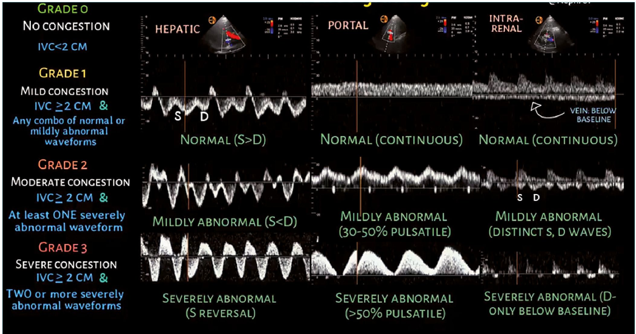 El análisis Doppler de la vena porta, la vena hepática y la vena venosa intrarrenal se utiliza en el sistema de clasificación VExUS. En presencia de una vena cava inferior sin colapso, cada una de estas venas se evalúa y se asigna a congestión normal, leve o grave[2] (Figura 1).