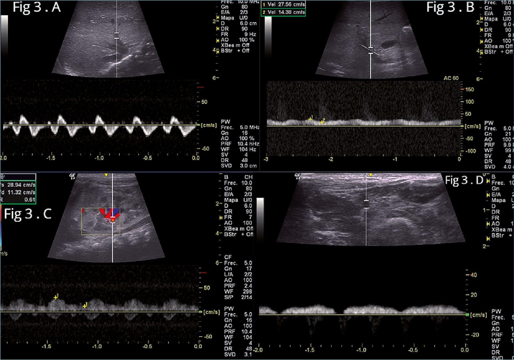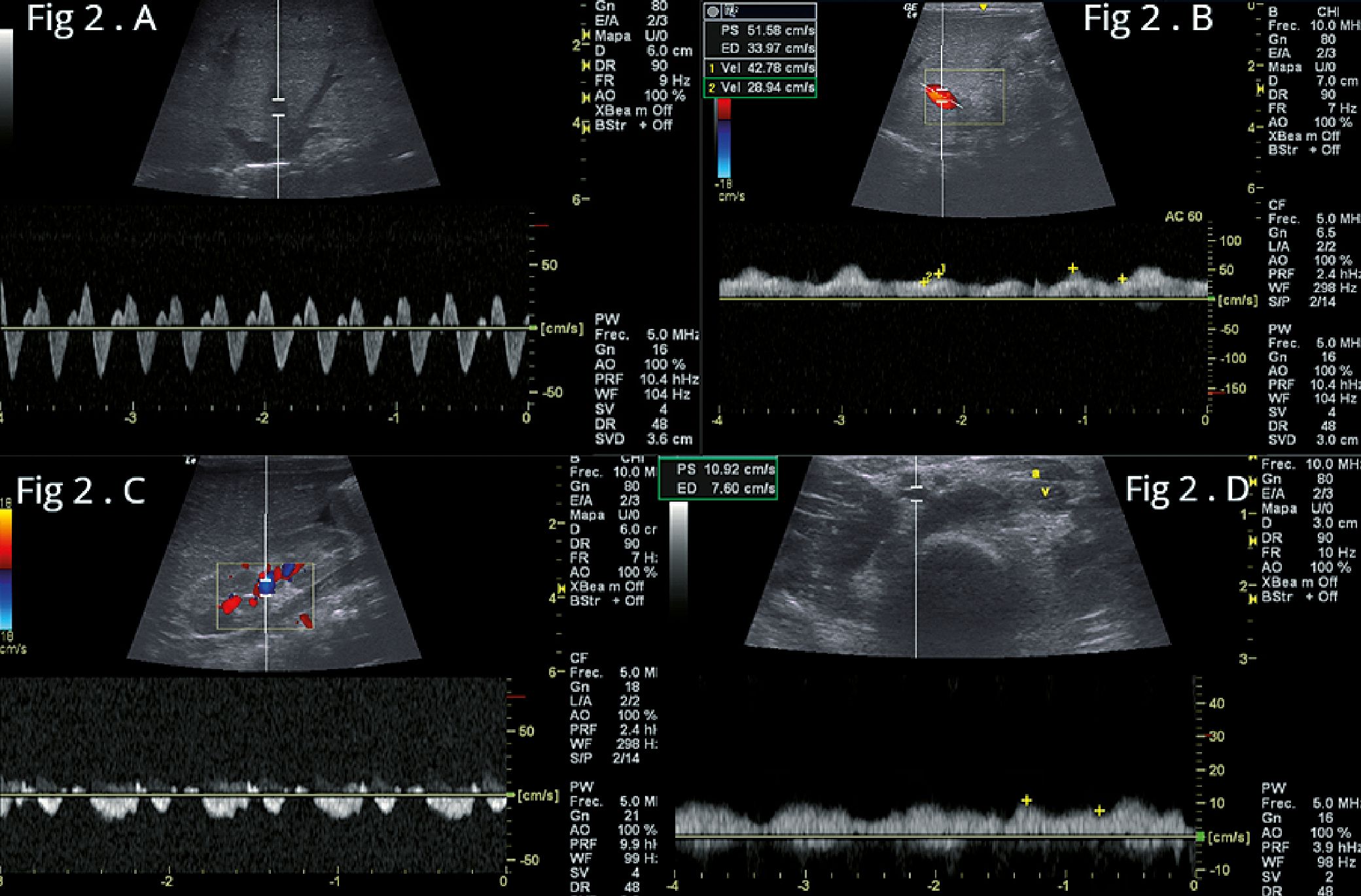 Figura 3. Flujos venosos después de 7 días de tratamiento. A: Flujo de la vena suprahepática, Trifásica con onda S > D y onda A persiste acentuada; B: Flujo de la vena porta, Pulsatilidad inferior: IP < 30%; C: Venas y arteria renal, vena renal pulsátil bifásica IRR: 0,61; D: Flujo de la vena femoral común, vena femoral con pulsatilidad disminuida.