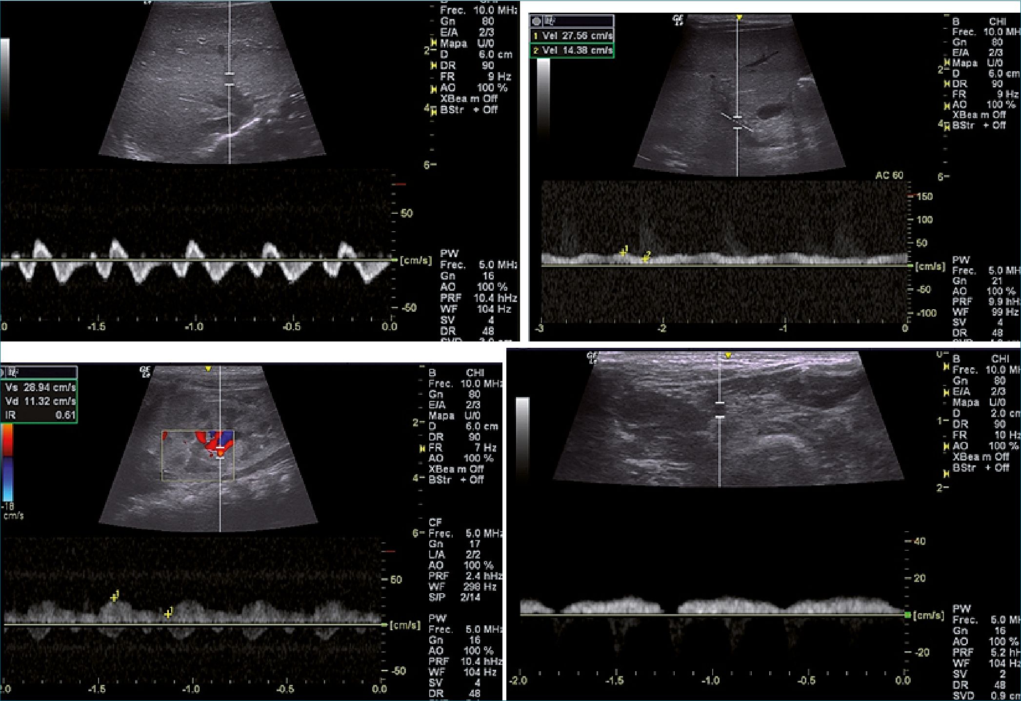 El flujo normal de la vena porta es monofásico con una leve ondulación y un índice de pulsatilidad < 30%, y el flujo normal de la vena renal es monofásico continuo[1].