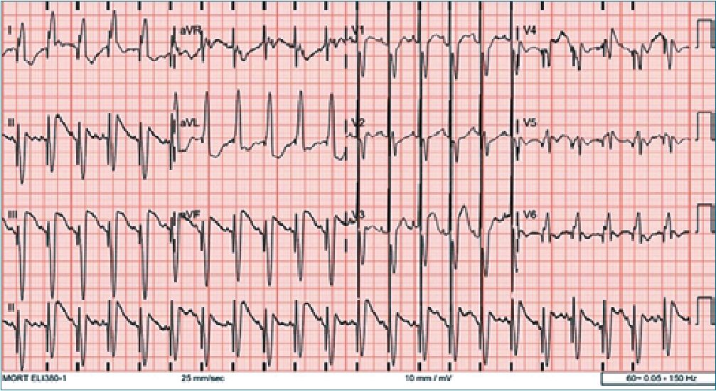 Figure 2. Initial electrocardiogram showing complete left bundle branch block, ST-segment elevation, T wave inversion, and a prominent QRS spike-findings suggestive of myocardial irritation or infiltration by the tumor.