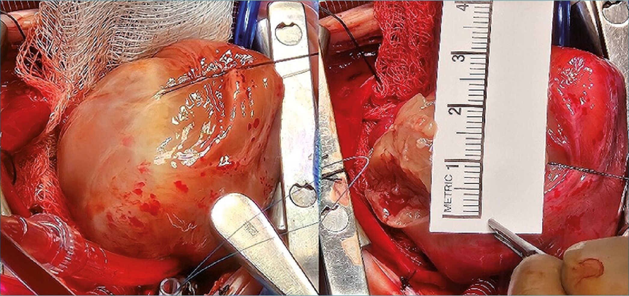 Figure 3. Intraoperative image showing the large fibroma after pericardiotomy. The tumor was closely adherent to the epicardial surface of the left ventricle and in proximity to the coronary vasculature. A surgical ruler confirms a maximal diameter of approximately 3.5 cm.