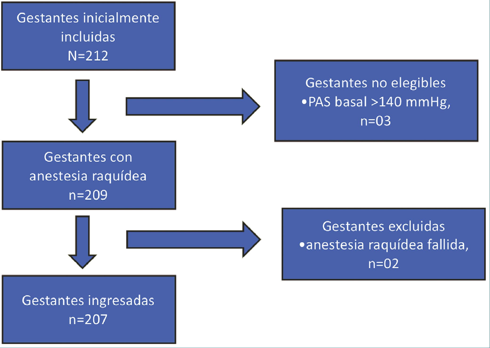 rante el período de recolección de datos. Se incluyeron cesáreas electivas y de emergencia, edades entre 18 a 45 años, riesgo anestésico ASA 2, se excluyeron anestesias con bloqueo incompleto o fallido, técnica anestésica combinada con epidural, trastornos hipertensivos del embarazo, PAS basal < 90 mmHg o > 140 mmHg, gestaciones pre y postérmino.