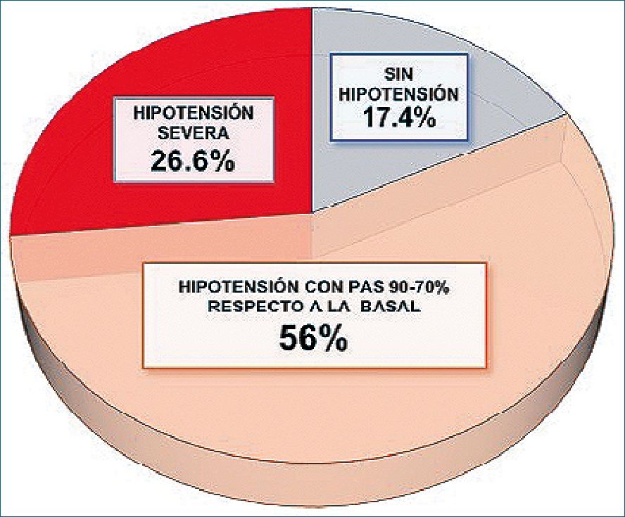 90% respecto a la PAS basal fue 82,6%, la disminución de la PAS entre 90%-70% fue 56% y la incidencia de hipotensión severa con PAS < 70% fue 26,6%, se contabilizó toda hipotensión severa como al menos un episodio registrado (Figura 2).