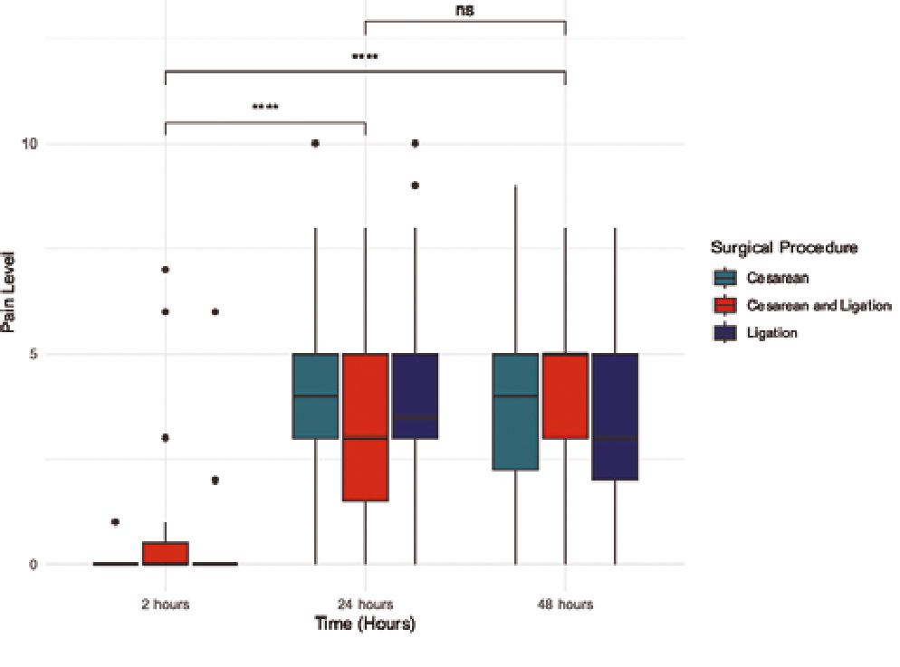In the bivariate analysis of pain levels in the post-anesthesia care unit (PACU) at 2 hours postoperatively, no statistically significant differences were found between the three types of procedures (cesarean section, cesarean section with ligation, and tubal ligation alone) at any of the observation times: 2, 24, and 48 hours (Table 2).