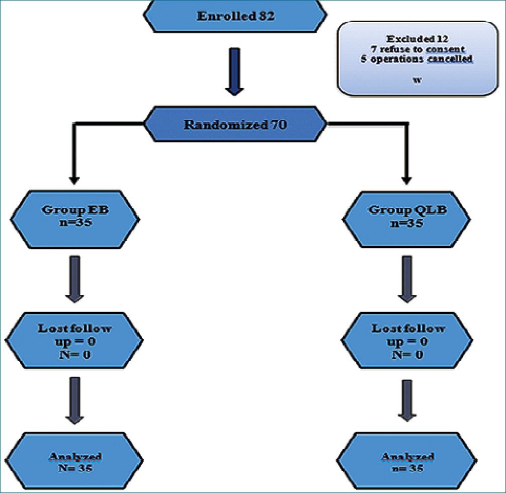 Using G* Power 3 software[11]. Depending on the results of an earlier study[12], a calculated minimum sample of 62 adults having open partial nephrectomies were needed. The sample was increased to include 70 patients to compensate the possible dropouts. Patients were divided into two equal groups (Group EB (n = 35); received epidural block, and group QLB (n = 35) received QLB to detect an effect size of 0.42 in the mean pain scores with an error probability of 0.05 and 80% power on a one tailed test.