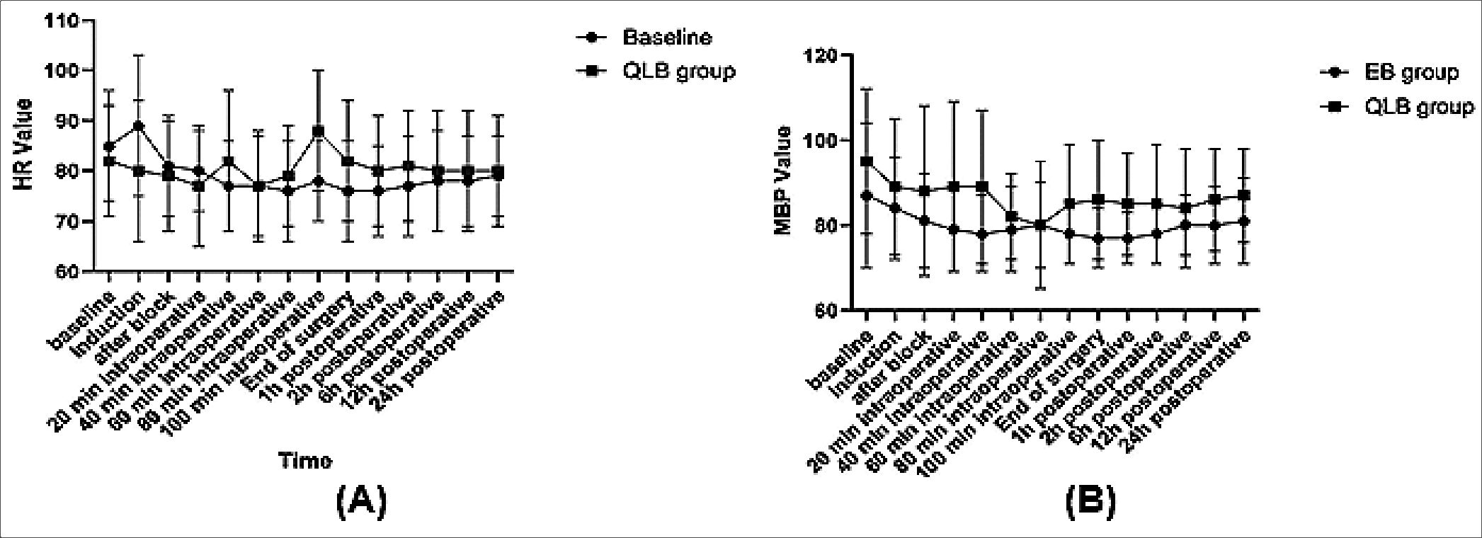 Likewise, EB group had significantly (P = 0.005) longer analgesia time denoted by delayed 1 st analgesia request (6 ± 1.3 hours) than QLB group (4 ± 1.5 hours). Also, EB group had significantly (P=0.043) lower opioid consumption (8 ± 2.7 mg) than QLB group (13 ± 3 mg) during first postoperative day.