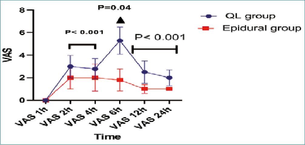 Demographic data, ASA status and surgery duration were insignificant between the studied groups Table 1. MAP and HR were significantly lower in the epidural group than QLB group (Figure 2). However, the differences were clinically insignificant as it still within the normal ranges. VAS scores were significantly lower in the epidural group than the QLB group through out the first 24 h postoperative (P < 0.05) Figure 3 and Table 2.