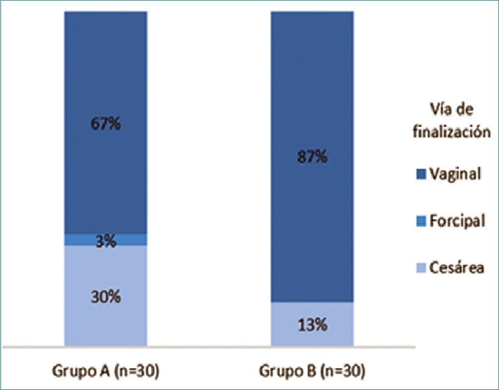 Respecto a la vía de finalización del embarazo, la mayoría de los partos fueron vaginales en ambos grupos (67% en el Grupo A vs 87% en el Grupo B), aunque se observó una mayor proporción de cesáreas en el Grupo A (30% vs 13%). Sin embargo, esta diferencia no fue estadísticamente significativa (p = 0,157) (Figura 3).