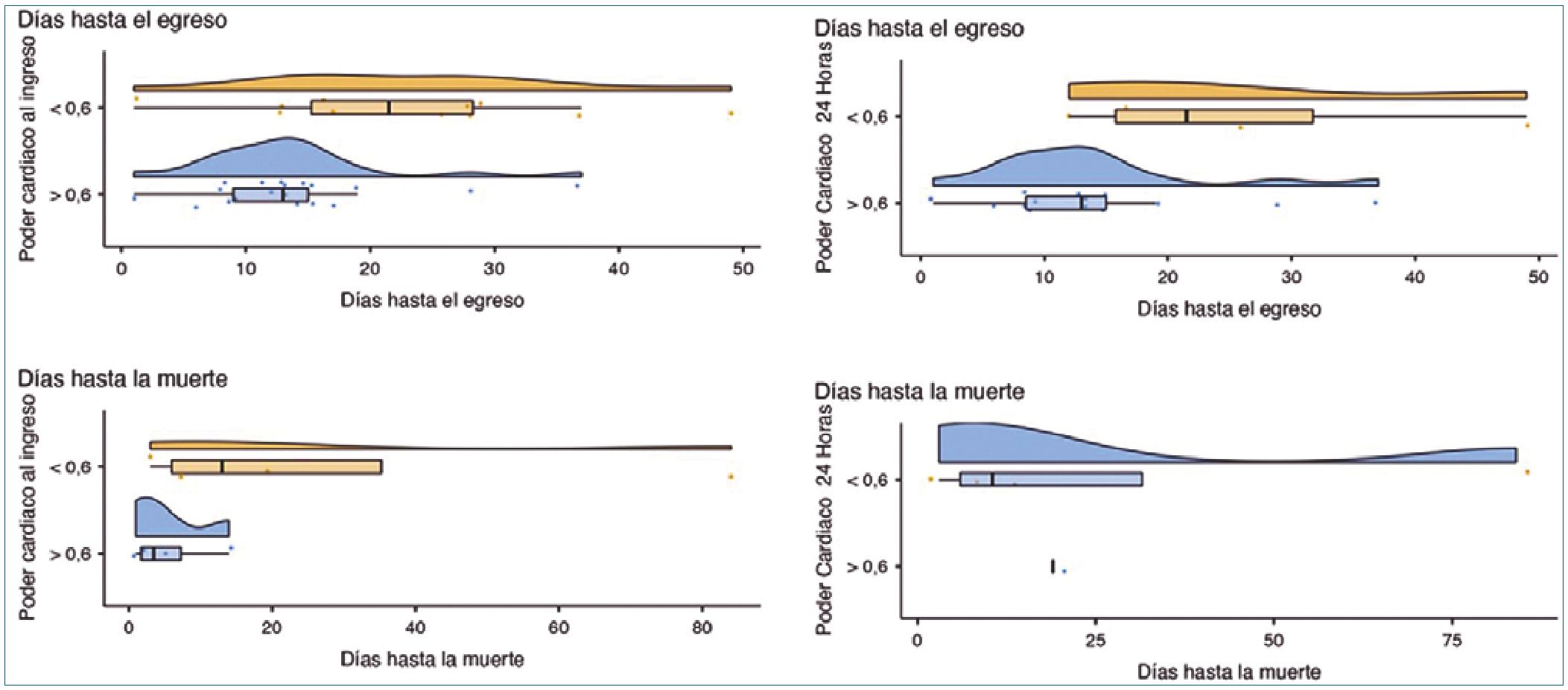 Además, se buscaron patrones o tendencias comparando las variables categóricas encontrando que a menor edad el poder cardíaco tendía a ser menor al ingreso a la unidad de cuidado intensivo y a las 24 h; así como, que los pacientes con un poder cardíaco menor a 0,6 W a las 24 h tuvieron más días de ventilación mecánica (PC menor 0,6 W – media 3,11 Vs PC mayor 0,6 W – media 1,56). También, al analizar los días hasta el egreso hospitalario, aquellos pacientes con un poder cardíaco al ingreso y a las 24 h menor de 0,6 W tuvieron mayor estancia hospitalaria; y con relación a los días hasta la muerte, aquellos pacientes con un poder cardíaco menor de 0,6 W al ingreso, la mayoría fallecieron los primeros 20 días de hospitalización (Figura 1). Llama la atención, que los 4 pacientes que fallecieron tempranamente tenían un poder cardíaco al ingreso mayor de 0,6 W, pero durante las primeras 24 h presentaron un descenso de más de 0,2 W e inferior a 0,6 W.