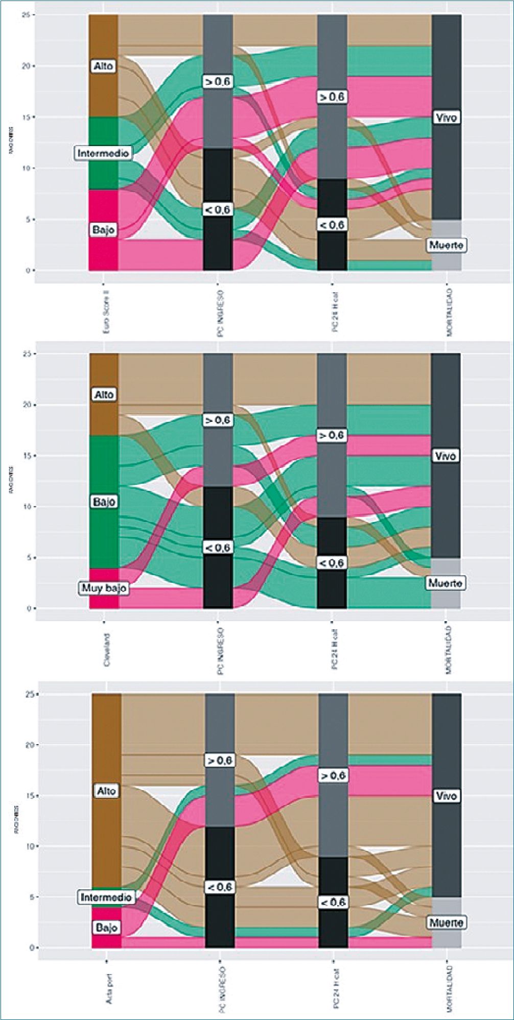 Por otro lado, la clasificación del riesgo prequirúrgico realizada a los paciente con el Euroscore II, Cleveland score y ACTA PORT score, al ser cotejada con el poder cardíaco al ingreso y a las 24 h, así como con la mortalidad, muestra que los pacientes que tuvieron un poder cardíaco inferior a 0,6 W al ingreso y a las 24 h, independientemente del riesgo, murieron; así como, los pacientes de alto riesgo que ingresaron con un poder cardiaco mayor de 0,6 W pero que durante las 24 h siguientes empeoraron y quedaron con un poder cardíaco inferior a 0,6 W, también murieron. Especialmente para el Euroscore II, llama la atención que los pacientes independientemente del riesgo que ingresaron con un poder cardíaco menor a 0,6 W pero que durante las primeras 24 h de estancia en la unidad de cuidado intensivo aumentaron su poder cardíaco a más de 0,6 W, sobrevivieron (Figura 2).