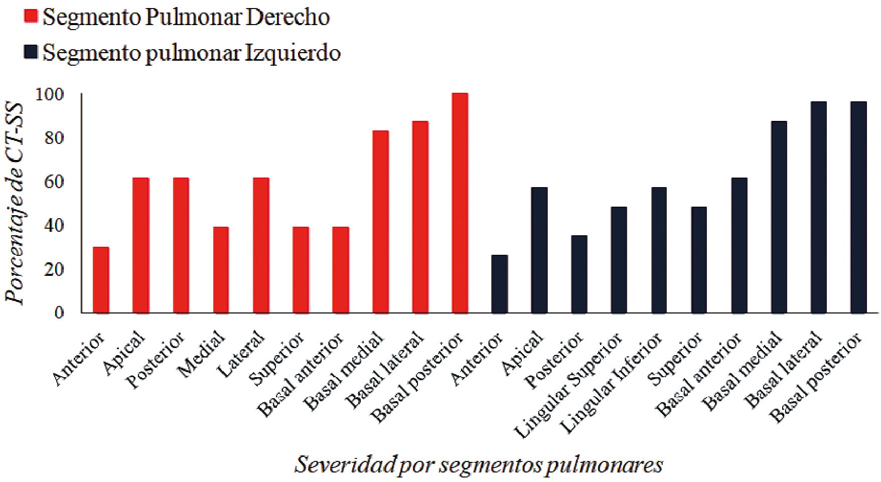 Se compararon las características sociodemográficas y clínicas de los pacientes con C-SDRA que cumplieron con los criterios de inclusión y exclusión. En la Figura 1, se visualiza el porcentaje de severidad por segmentos pulmonares determinada por el CT-SS que presentaron los pacientes (n = 23) previo ingreso a UCI sin tener conexión a VM.