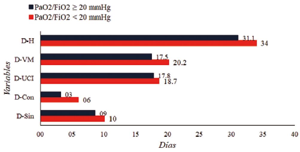 La evolución clínica de los pacientes se puede apreciar en la Figura 2, donde se evidencia que los pacientes del grupo PaO2/ FiO2 con mejora menor 20 mmHg, fueron pacientes con más días sintomáticos antes que se confirmara que estaban positivos a COViD-19, necesitaron más días en UCi, conexión a VM, lo que representa más días de hospitalización.