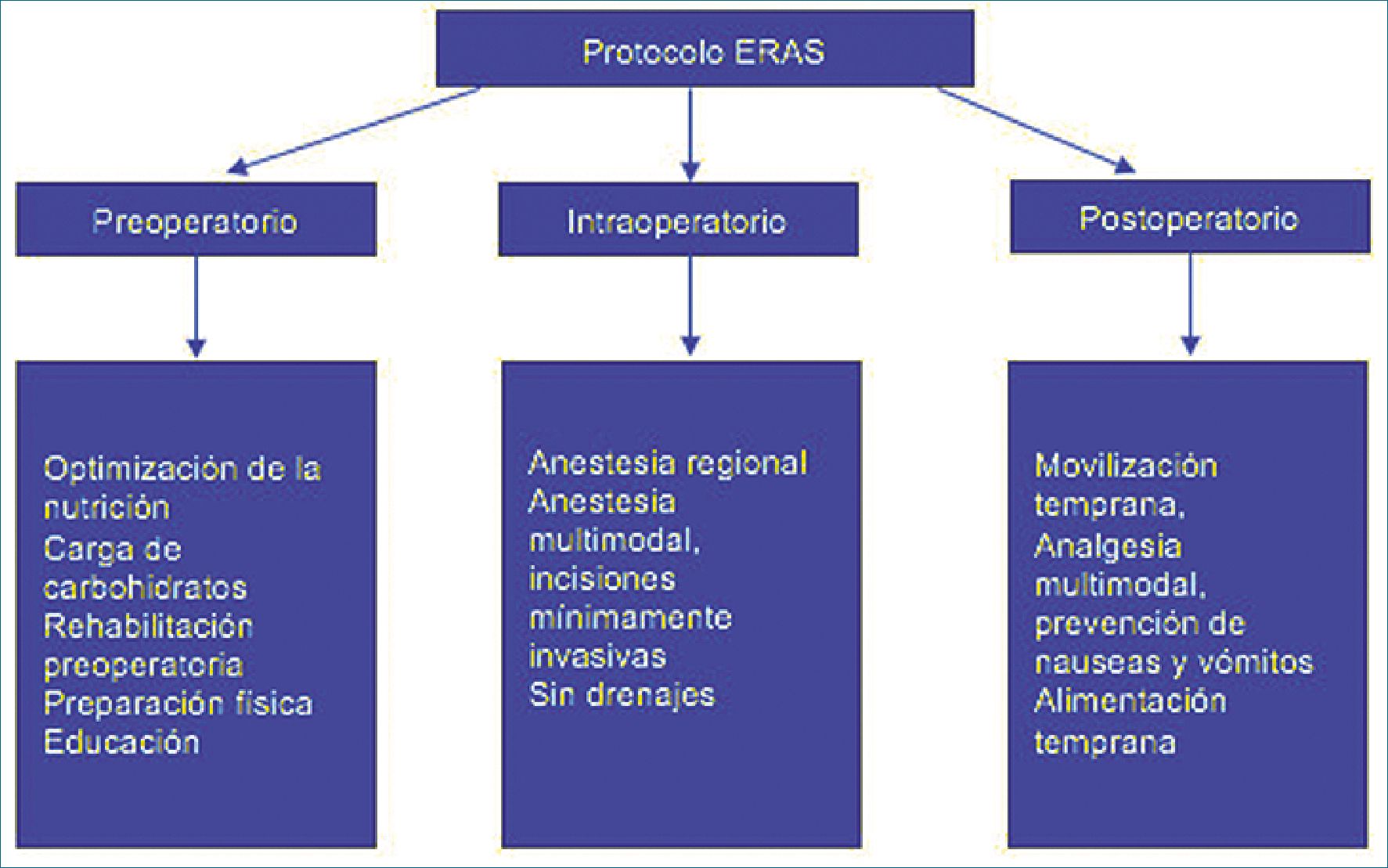 En ERAS son variadas intervenciones preoperatorias, intrao- peratorias y posoperatorias que han demostrado disminuir la cantidad de estrés y disfunción en los pacientes sometidas a cirugía, y conducen a mejor recuperación, menor morbilidad y duración de la estancia hospitalaria[3].