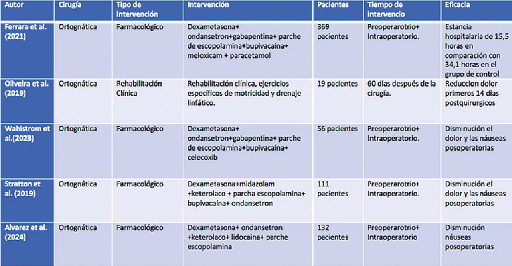El protocolo ERAS es seguro y efectivo para cirugía ortogná- tica, disminuyendo el dolor posoperatorio, las náuseas y vómitos posoperatorios y reduciendo la prescripción de opiaceos y con menos dias de hospitalización.