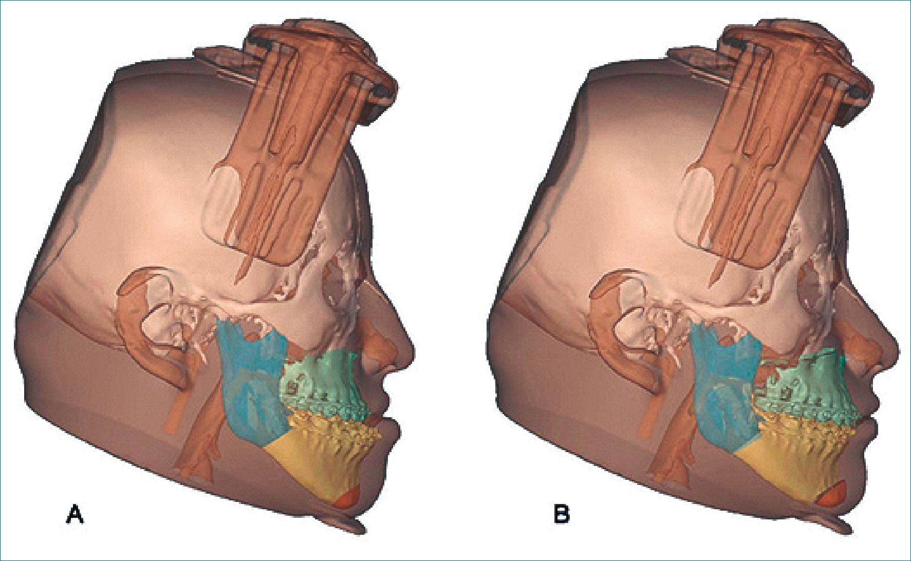 Figura 4. Cirugía de planificación virtual en paciente con dismorfosis dentofacial clase III con predicción de tejidos blandos. (A) Preoperatorio; (B) Posoperatorio en cirugía ortognática.