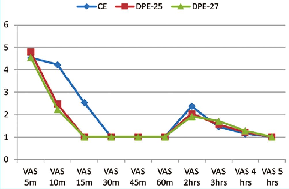 There were no variations in motor blockade degree. Throughout the trial, all patients had a Bromage score of 0, except for one patient in the CE Group, who had a Bromage score of 1-2 for the first hour of analgesia. However, it resolved to a Bromage score of 0 (p = 0.654). The mean VAS parturient score was 4.23 ± 0.43 in the CE group, 2.48 ± 0.58 in DPE-25, and 2.24± 0.44 in DPE-27 at minute 10. Conversely, it was 2.54 ± 0.51 in the CE group, 1 ± 0 in DPE-25, and 1 ± 0 in DPE-27 at minute 15. These results denote marked differences between the CE group and the other two DPE groups at minutes 10 and 15. (p < 0.05). However, these differences did not reach statistical significance at any other time (Figure 2).