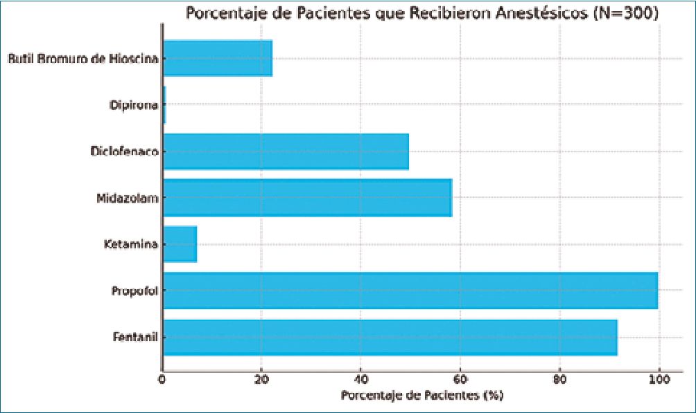 En cuanto a la administración de opioides, el fentanilo fue el fármaco más utilizado, administrado en 275 pacientes (91,7%) en dosis de 50 mcg ajustadas según la necesidad de analgesia, mientras que el remifentanilo fue administrado a 5 pacientes (1,7%) en dosis de 1 mcg/kg/min. El midazolam se administró en 175 pacientes (58,3%) en dosis de 1 mg, mientras que el propofol, el hipnótico más común, se administró en 299 pacientes (99,7%) con una dosis de 1 mg/kg administrados en bolo, permitiendo una inducción rápida y un control adecuado de la sedación. La ketamina fue utilizada como coadyuvante en 21 pacientes (7%) en dosis de 1 mg/kg. Para el manejo del dolor, 149 pacientes (49,7%) recibieron diclofenaco en dosis única de 75 mg y 67 pacientes (22,3%) recibieron butilbromuro de hioscina en dosis de 10 mg (Tabla 5).