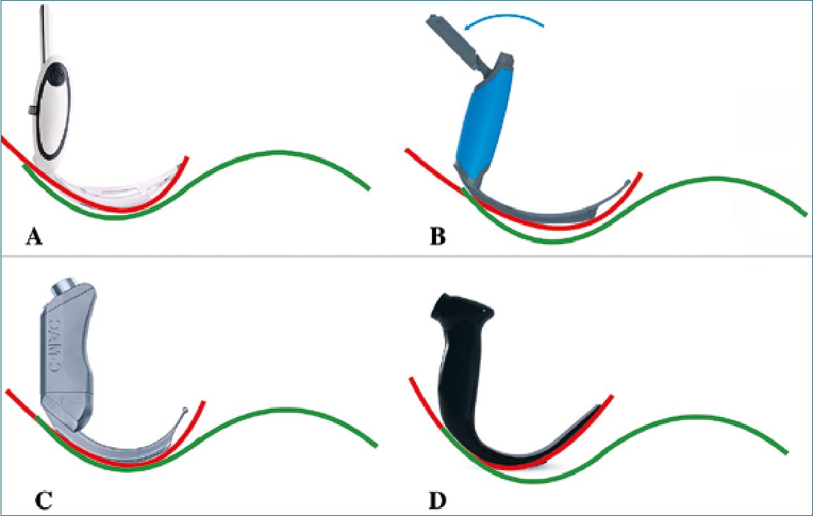 Figura 4. Esquema que ilustra el concepto de relación entre curvatura 1ria paciente y curvatura de la hojas hiperanguladas de distintos videolaringoscopios A: McGrath MAC; B: ProVu Hi- per4; C: MAC; D: Blade, Glidescope LoPro S4.