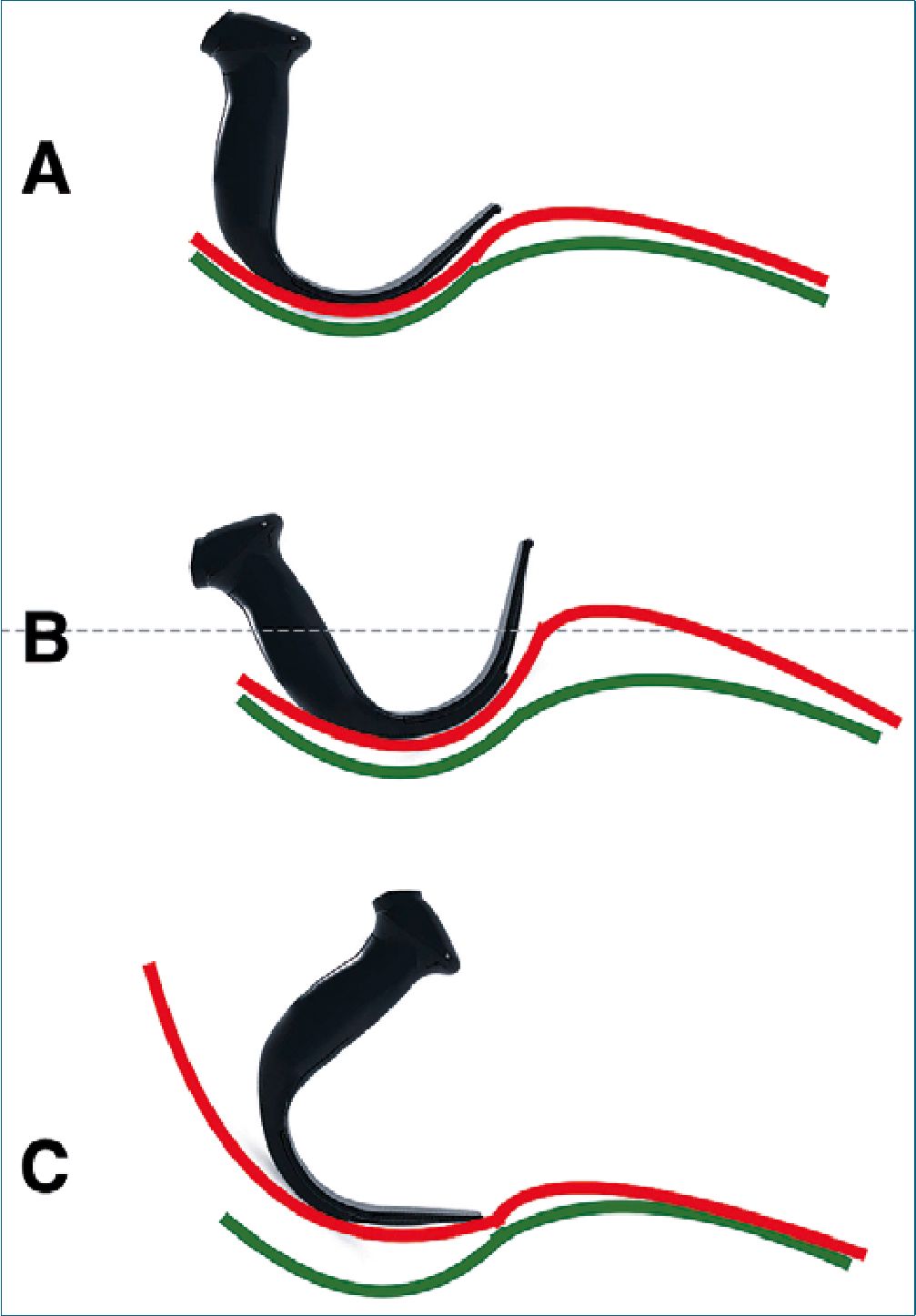 Figura 6. Efecto posición hoja en transición curvaturas. A: Diseño de hoja es concordante con curvatura primaria de paciente; B: Operador aplica exceso de deflexión para buscar visión cercana, de forma curva primaria aumentando ángulo de inflexión; C: Operador corrige maniobra reduce deflexión laríngea y quita carga.