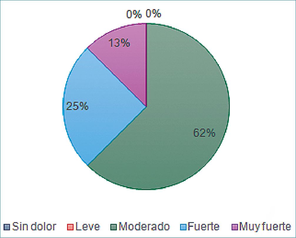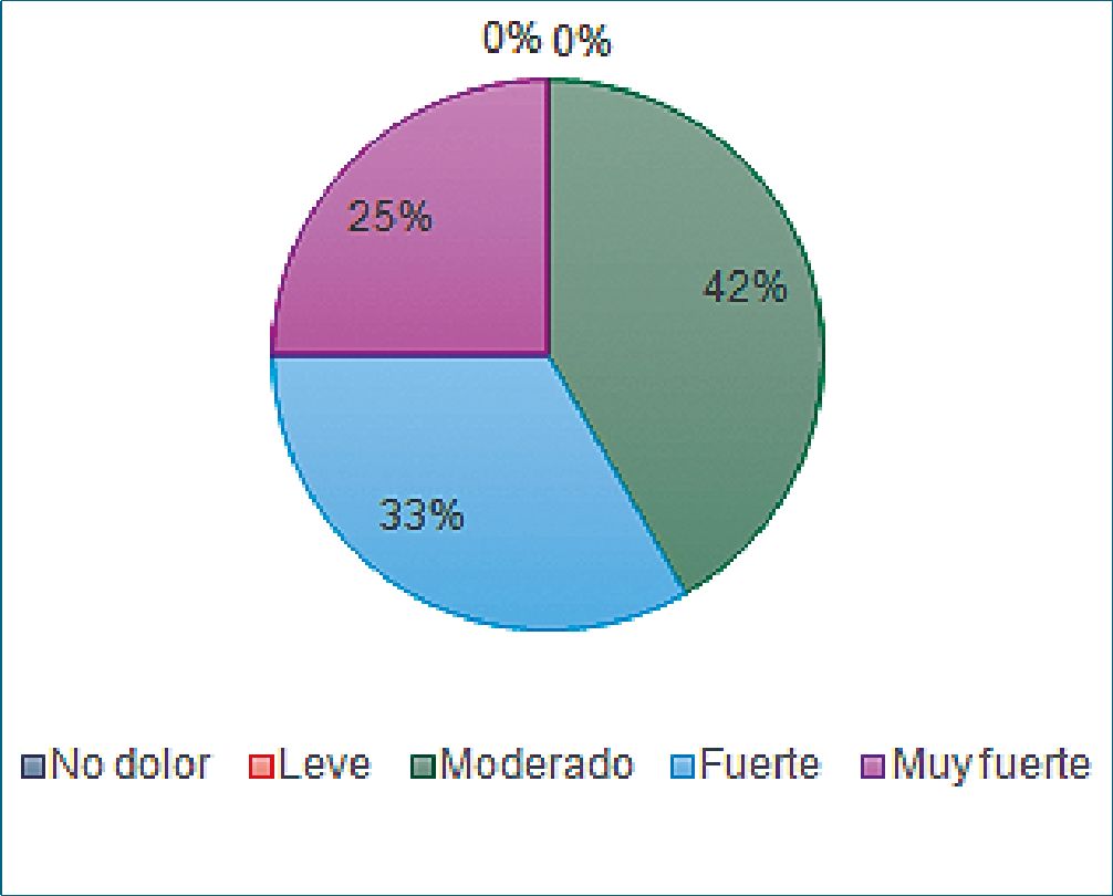 A la hora del egreso del área de procedimientos los pacientes presentaron dolor moderado en mayor frecuencia (Figura 2). Al evaluar la intensidad de dolor a las dos horas posteriores al egreso de la sala de procedimientos, se observó un mayor porcentaje de dolor moderado en la población (Figura 3).