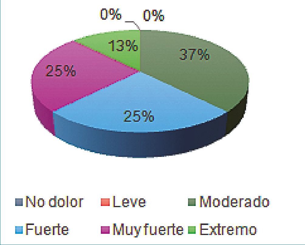 Al evaluar los grados de dolor al egreso de la sala de procedimientos se observó un mayor porcentaje de pacientes con dolor moderado. Al analizar los pacientes con dolor, se clasificaron en grados de acuerdo a la presencia del mismo (Figura 1).