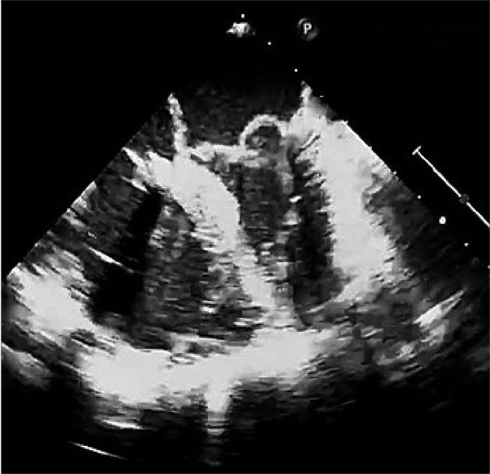 Figura 2. ECG TE proyección medio esofágica 4 cámaras a 0°. Ventrículo derecho dilatado, septo interventricular desplazado hacia la izquierda por sobrecarga de volumen y presión.