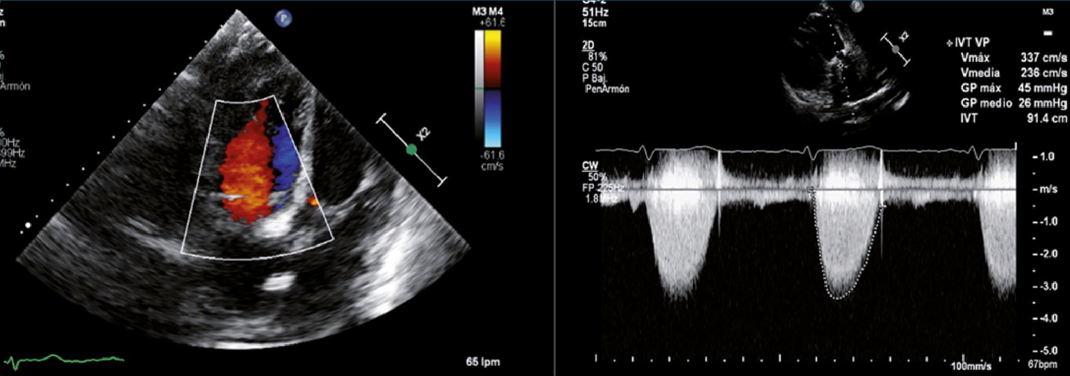 Figura 3. A y B. A: ECG TT plano apical 4 cámaras. Prótesis biológica en posición tricúspide con Doppler color que descarta fugas para valvulares, sin evidencia de insuficiencia transprotésica; B: ECG TT plano transversal grandes vasos. Doppler continuo a nivel de la bioprótesis pulmonar que permite calcular un Gradiente pico 45 mmHg, Gradiente medio: 26 mmHg, velocidad Max 3,36 ms/s considerándose prótesis biológica normo funcionante.