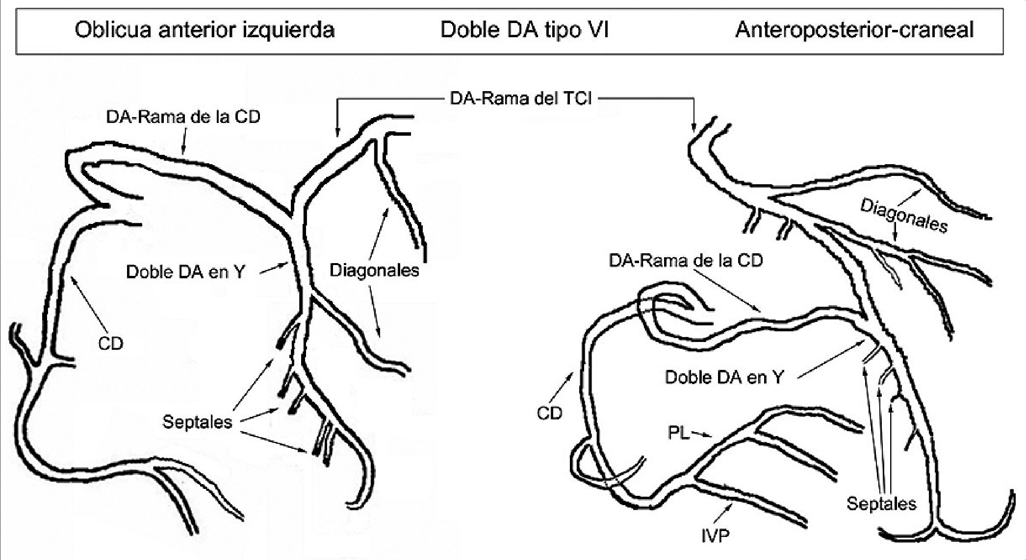 Figura 3. Representación esquemática de la variante anatómica tipo IV según Spindola- Franco. CD: coronaria derecha; DA: descendente anterior; IVP: interventricular posterior; PL: posterolateral; TCI: tronco coronario izquierdo.