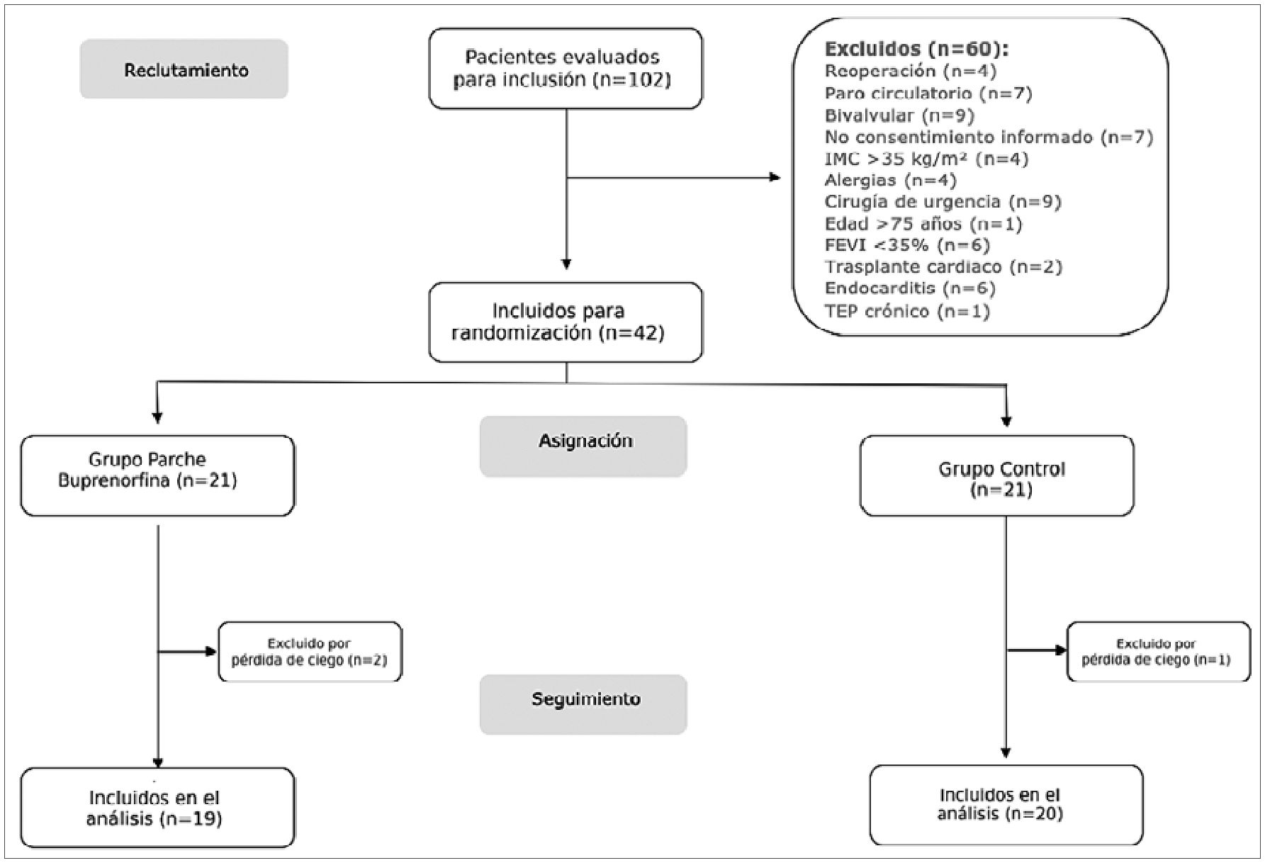 Durante el período comprendido entre marzo y octubre de 2024 se reclutaron un total de 102 pacientes, de los cuales 60 fueron excluidos por criterios predefinidos (reoperación, cirugía con paro circulatorio, cirugía bivalvular, cirugía de urgencia, trasplante cardíaco, endocarditis activa, tromboendarterectomía pulmonar, ausencia de consentimiento informado, IMC > 35 kg/m2, edad > 75 años, FEVI < 35% y alergias a fármacos del protocolo). Finalmente, 42 pacientes cumplieron los criterios de inclusión y fueron aleatorizados: 21 al grupo parche de buprenorfina y 21 al grupo control (placebo).