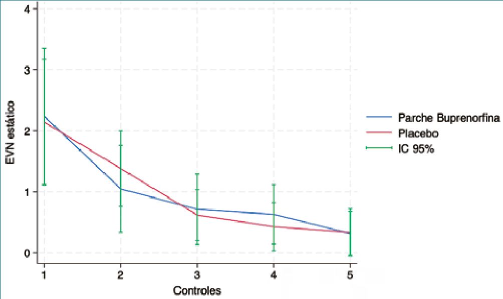 Durante el seguimiento, se registraron 3 exclusiones (dos del grupo parche y uno del grupo placebo), todas ellas asociadas a pérdida del cegamiento producto de la remoción del apósito. De este modo, el análisis final se realizó sobre 39 pacientes: 19 en el grupo buprenorfina y 20 en el grupo control (Figura 1).