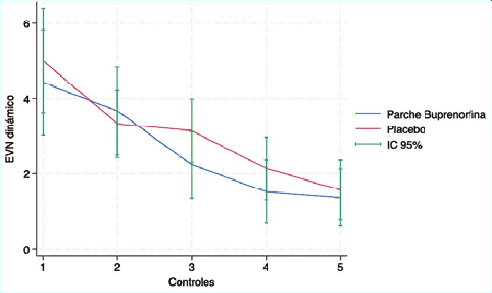 En este ensayo randomizado doble ciego, evalúa el parche transdérmico de buprenorfina en cirugía cardíaca, no se observaron diferencias clínicamente ni estadísticamente significativas en la intensidad del dolor posoperatorio entre el grupo parche (5 pg/h) y el grupo control, tanto para EVA estático como dinámico a lo largo de los cinco controles programados. Asimismo, la incidencia de eventos adversos (NVPO, constipación, retención urinaria) y el uso de opioides de rescate fueron similares, con intervalos de confianza anchos que descartan beneficios clínicamente relevantes de la intervención.