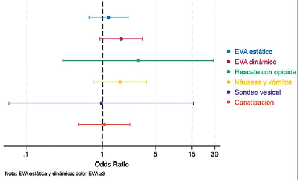 El análisis descriptivo de la muestra se realizó mediante frecuencias y porcentajes para variables categóricas, y medias con desviación estándar para variables continuas. Para el análisis del desenlace principal, la escala EVA se categorizó en dos niveles: ausencia de dolor o dolor leve (EVN < 3) y dolor significativo (EVN > 3). Dado que se trata de un estudio prospectivo longitudinal con cinco mediciones repetidas (a las 12, 24, 48 y 72 h, y al séptimo día posoperatorio), se aplicó un modelo de regresión logística multinivel para estimar unOdds Ratio (OR) resumen a lo largo del seguimiento.