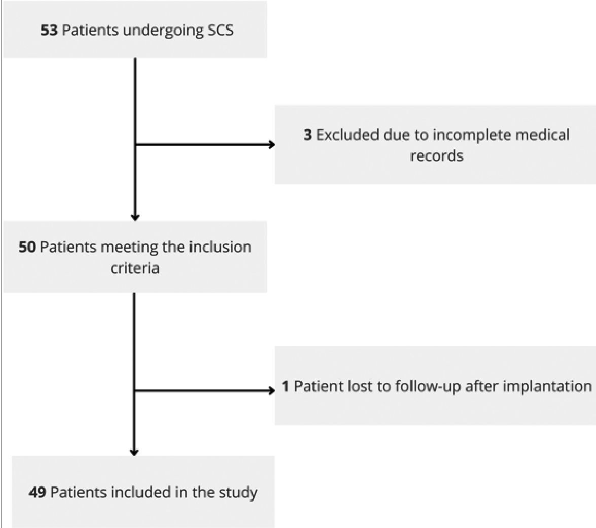 A total of 53 patients were screened for inclusion; after applying the eligibility criteria, 49 patients who underwent dorsal column stimulation for refractory chronic pain were included (Figure 1). Of these, 25 patients (51%) were classified as responders and 24 (49%) as non-responders. Most patients were male (61.2%), with a mean age of 46.9 ± 12.83 years. A significantly higher proportion of non-responders were not receiving any medication compared with responders (p = 0.048) (Table 1).